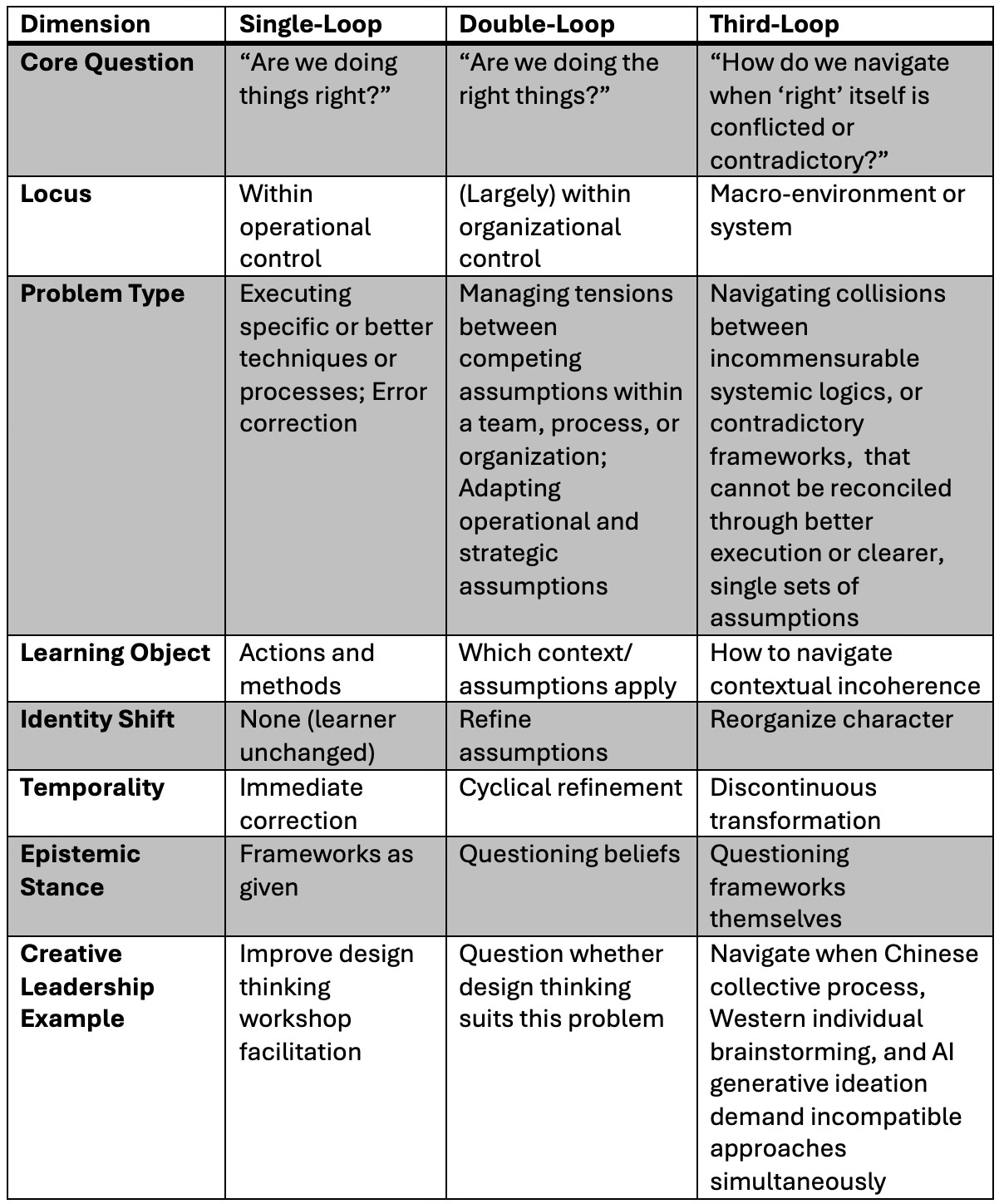 This distinction matters because global creative leaders increasingly face polycontextual environments where Chinese relational harmony, Western individual merit, European rulemaking, Gulf hierarchical deference, and AI-driven algorithmic logic make mutually exclusive demands simultaneously. The third loop addresses not only better problem-solving within given contexts but what Bateson called the “reorganization of character,” the transformation of the learner’s (and, here, the leader’s) own identity when navigating contextual incoherence that cannot be resolved through improved assumptions alone (Bateson, 2000).