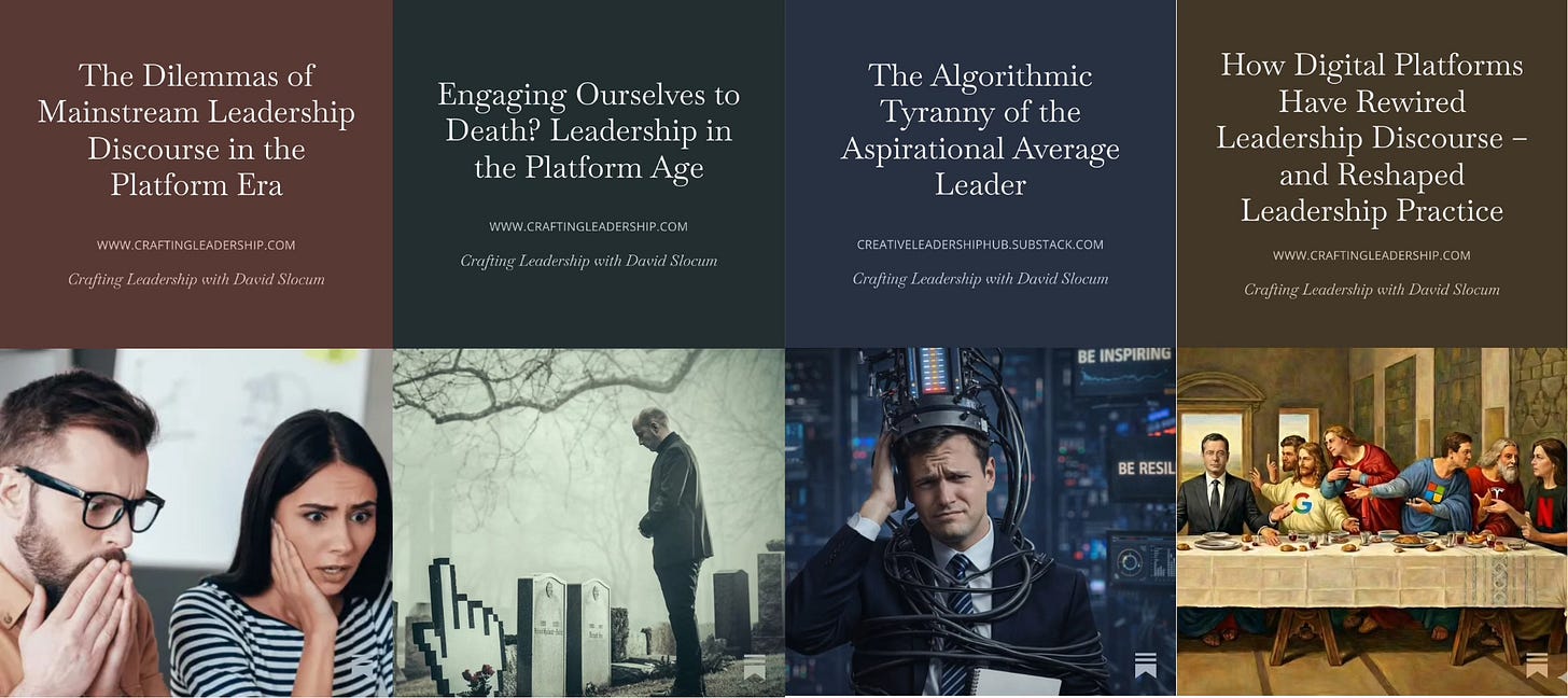 David Slocum (2025a) “The Dilemmas of Mainstream Leadership Discourse in the Platform Era,” Creative Leadership Hub, Substack, February 21, 2025; https://www.craftingleadership.com/p/the-dilemmas-of-mainstream-leadership